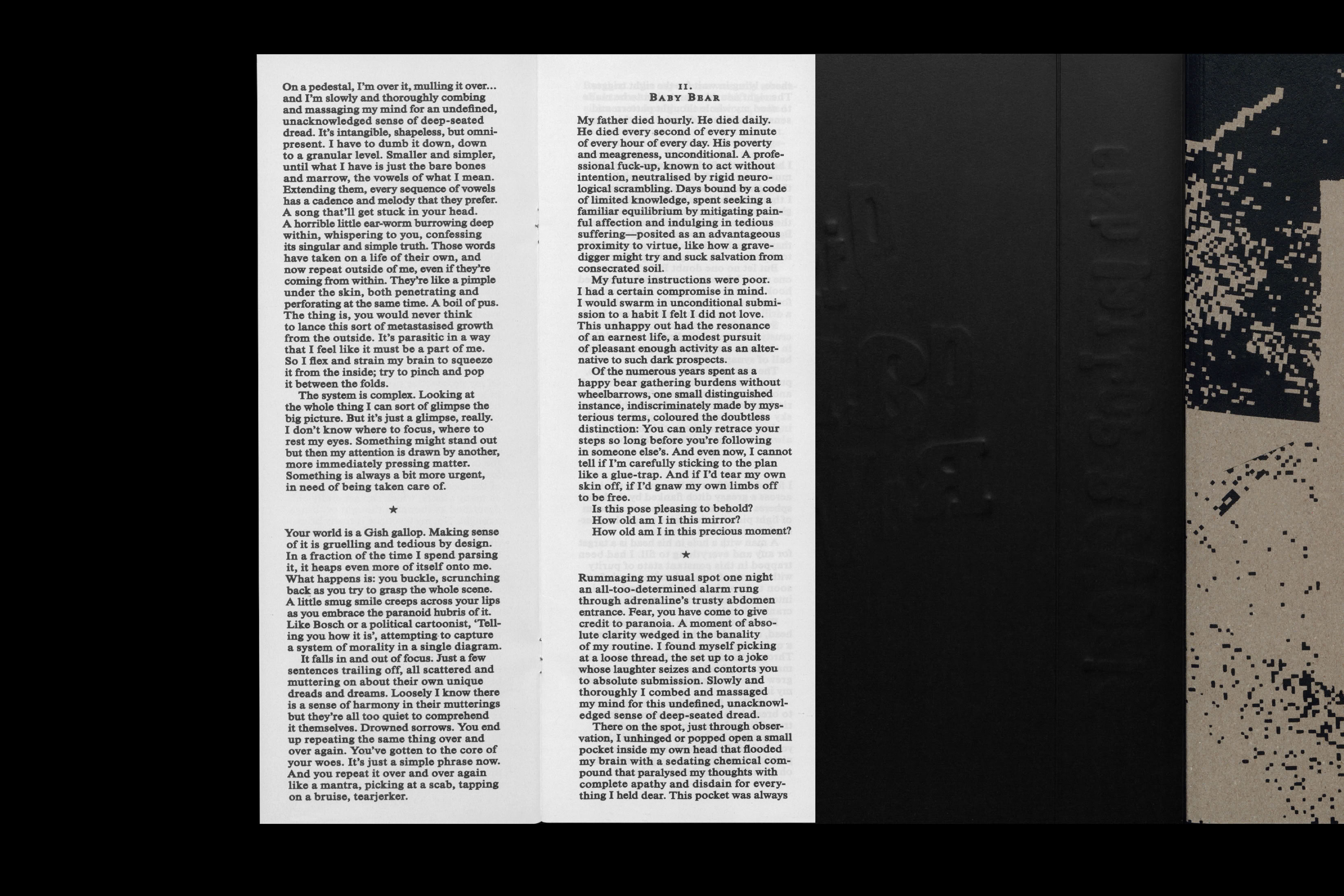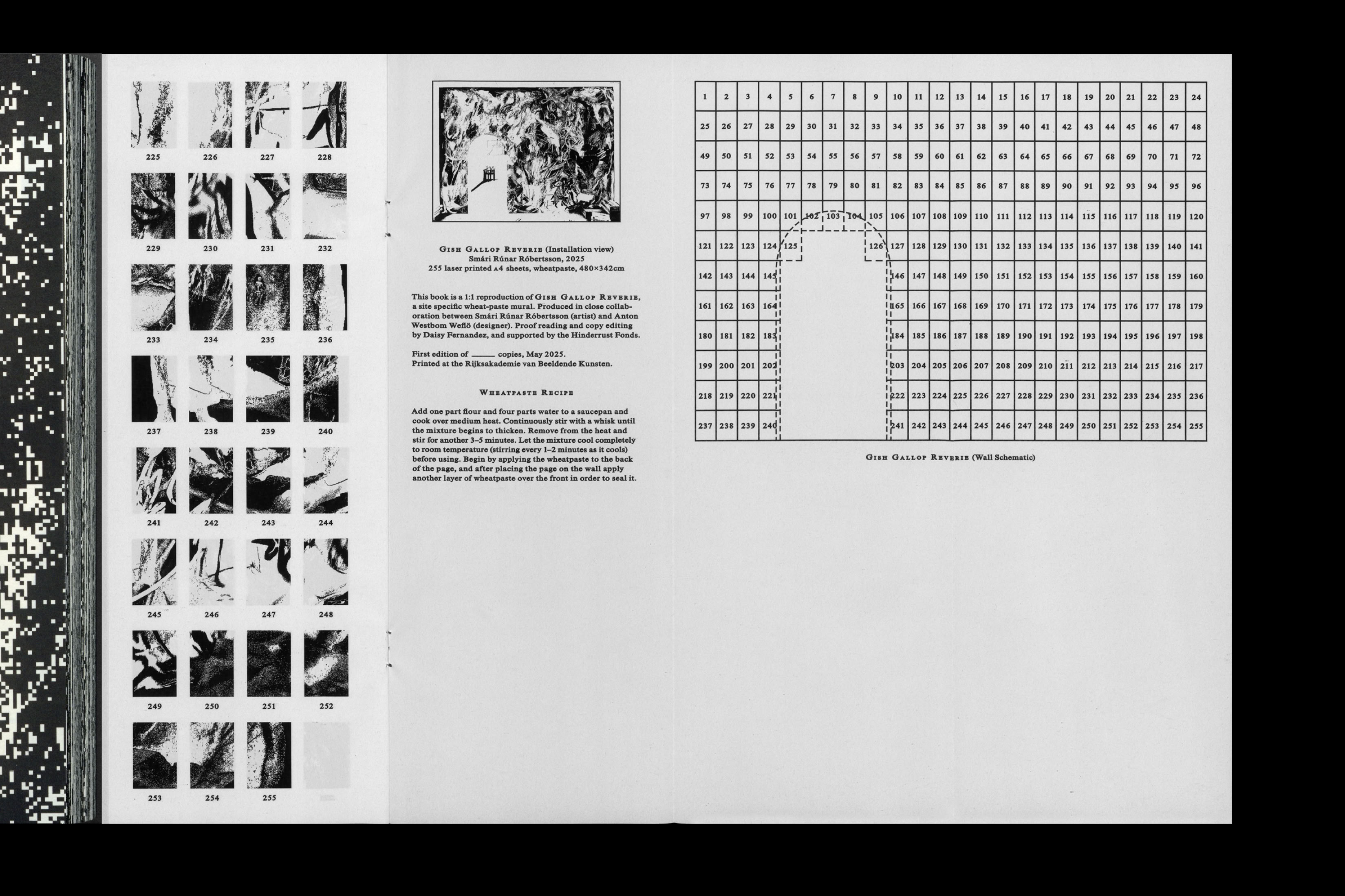 The installation consisted of a site-specific pixel drawing mural in my studio composed of 255 laser-printed A4 sheets applied with wheat-paste (480 × 342 cm). It also features 11 soapboxes made of oak and painted with acrylic, with variable dimensions. Daily reading performances took place from May 20 to 25, 2025. A publication accompanies the work: 1:1 Mural, Gish Gallop Reverie – Collected Writings, designed by Anton Westbom Weflö.
